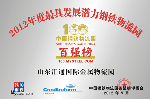 山東匯通國際金屬物流園榮獲“2012年度最具發展潛力鋼鐵物流園”榮譽稱號
